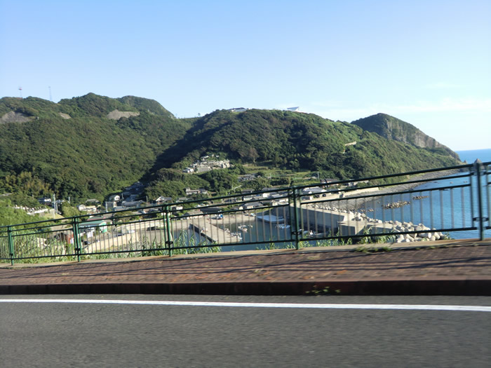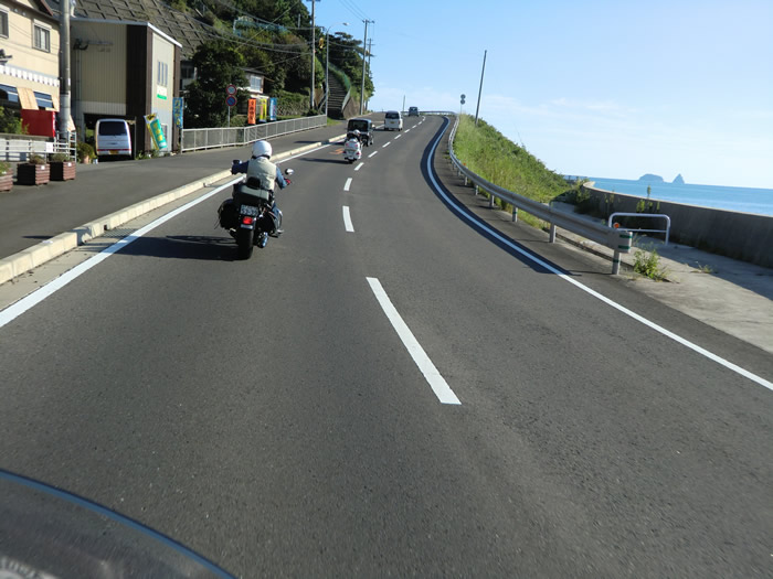 R202を日本海に沿って長崎のまちへ。右手の海に、珍しい形の岩を発見。くじらに見え |