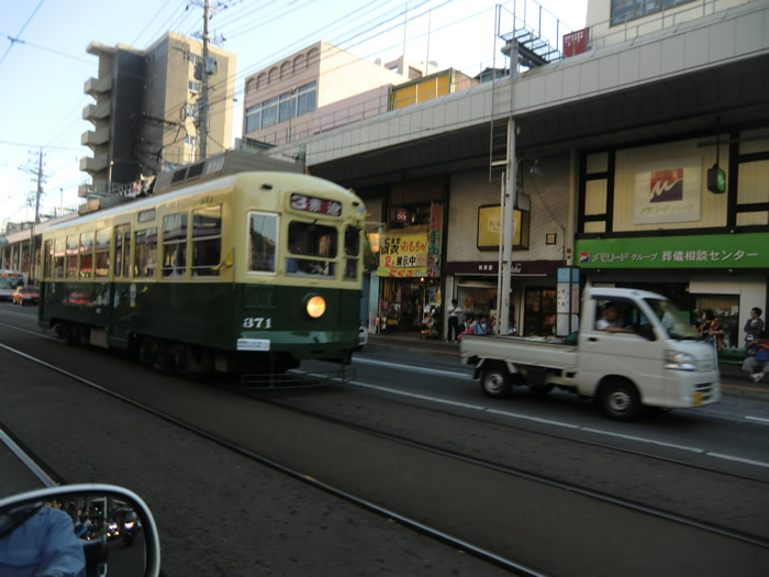 奈良には無い路面電車がめずらしい。交差点の信号にとまどう。 |