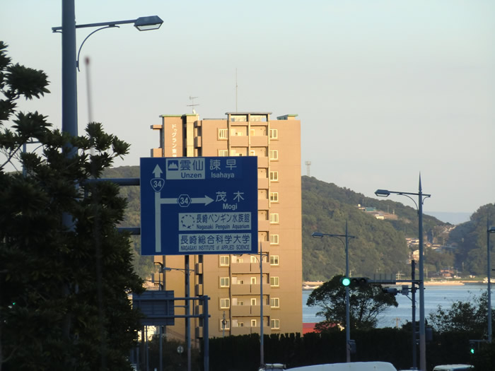 道路案内に「雲仙」が表示。R34へ進行や。 |