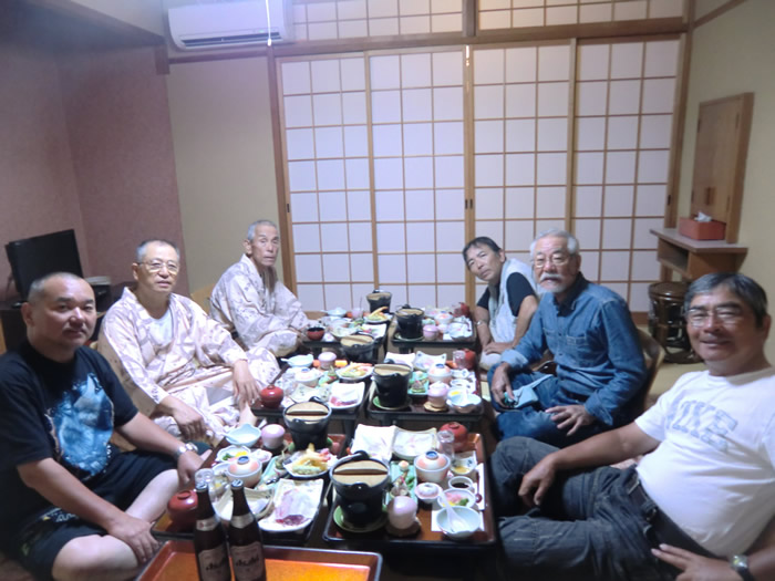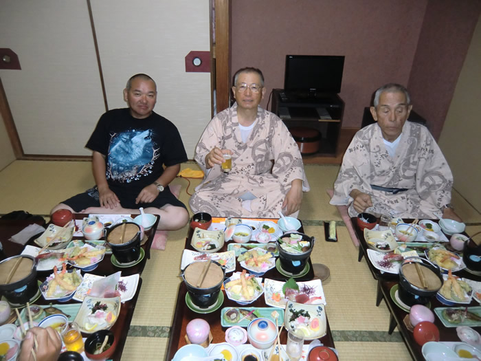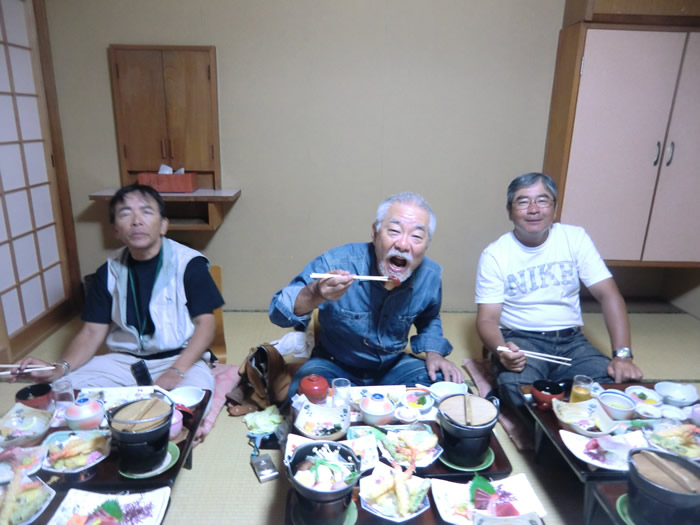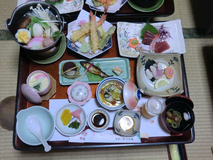 雲仙いわき旅館の夕食です。豪華ですね。馬刺しもある。