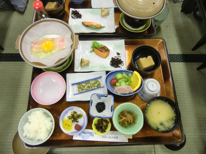 旅館の朝食です。いわちゃん・・半熟はあかんねん。固形燃料くださあい。 |