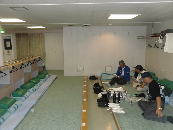 ![]() 部屋は、4階中央 340号だ。バイクとセットで13000円や。2等船内の様子。1人分の 約80cm、寝返り禁止。1から6番が僕たちの場所だ。 服のまま寝るんや。 |
