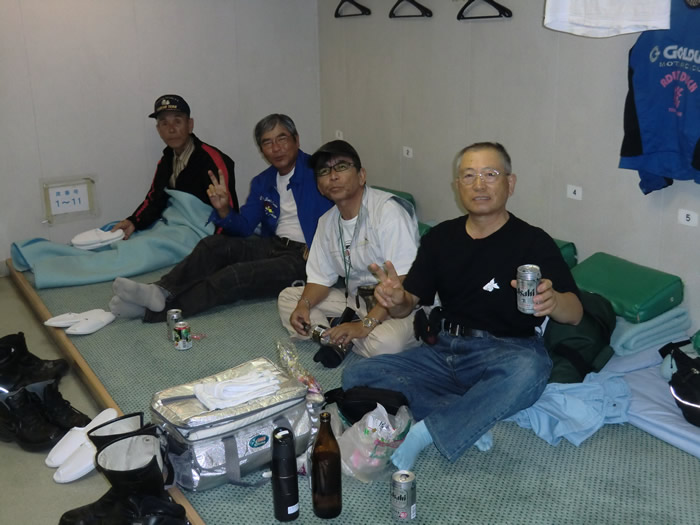 ![]() 荷物を降し、いわさんが、ビールを買いに行ってくれた。とりあえず、ビールを飲んで、落 ち着く。おーさんは、早々と毛布にもぐった。 |