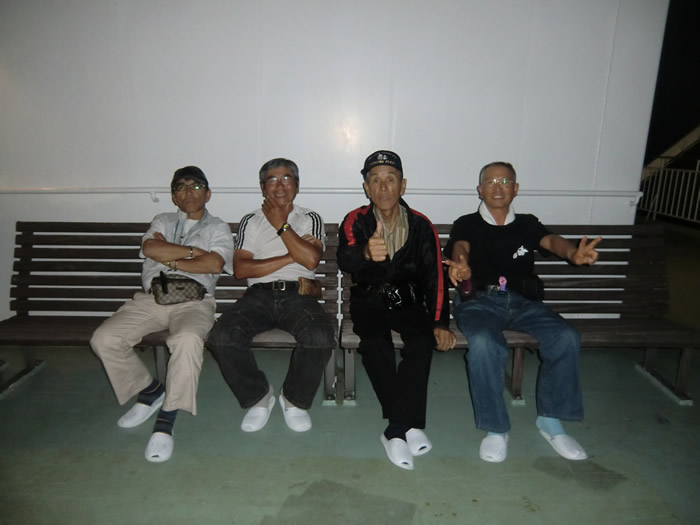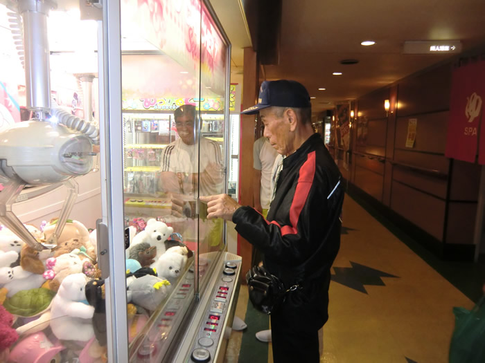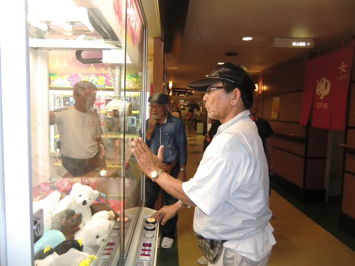 ![]() 船内の遊技場で、おーさんが、意地になって、時計を狙うも、ゲットならず。若い兄ちゃん が、2回で、時計をゲット。この時計をやなさんが貰う。 |