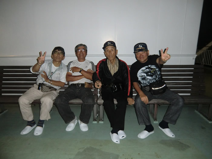 ![]() 食後甲板のデッキで、風にふかれる。少し寒かった。スリッパは、いわちゃんが買ってく れたのだ。 |