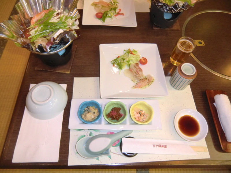 お料理です。これから刺身、天ぷら、むかごご飯などがでてきます。寿司桶もあります。 |