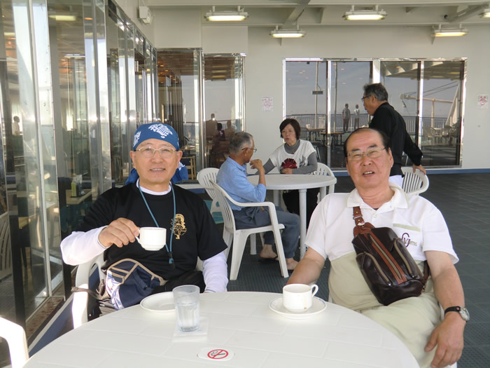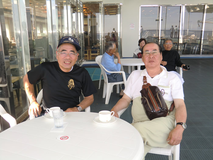 ![]() いい朝だねえ。食後デッキでくつろぐ、えーさんとはっしゃん。 コーヒーが美味い。 |