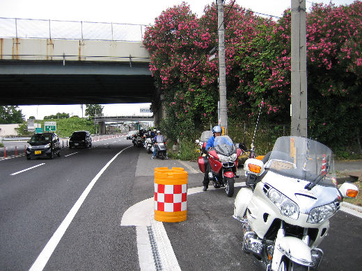R24の郡山は路肩が狭くなってました GL1800はクニちゃん・・ 赤いBMWは益田会長・・ 赤い花は、キョウチクトウだね