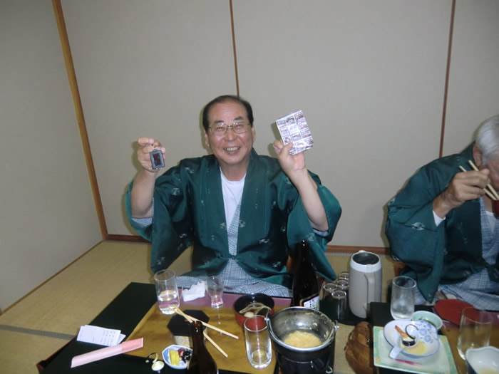 ![]() 早いビンゴで景品をゲットし喜ぶ橋やん。 |