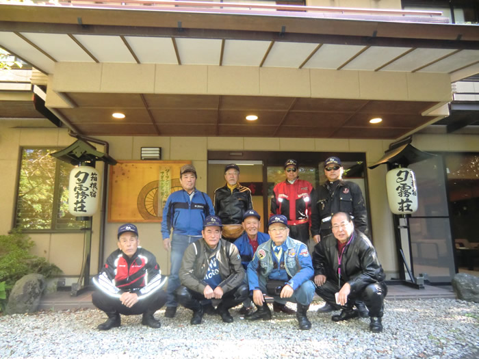 ![]() 夕霧荘前で記念写真。 AM 9:30出発。 今日も最高の天気でラッキー。 これから 箱根 駅伝コースを走ります。 バイクで。 10キロ先の富士屋ホテルまでを往復します。 |