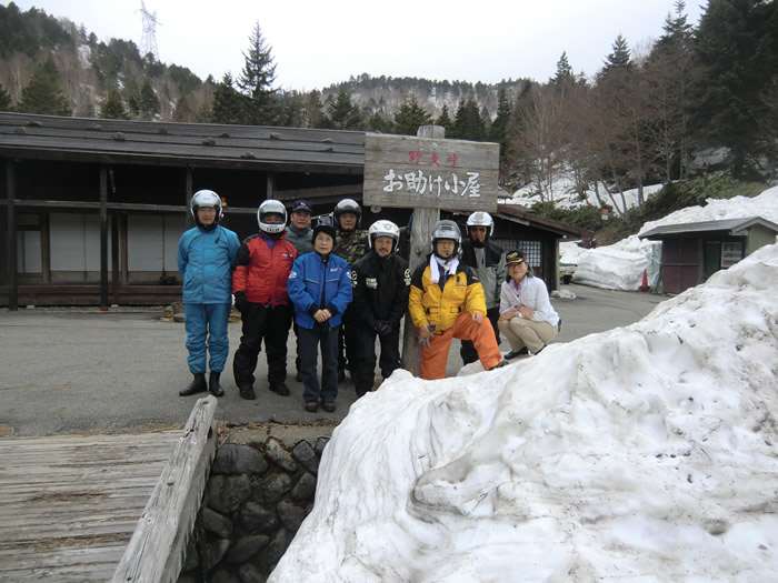野麦峠のお助け小屋で記念写真。奈川渡ダムからR158、乗鞍、丘の上フュツテへ。 pm5:20着。草津PA→354.4km、所要時間、9時間20分。