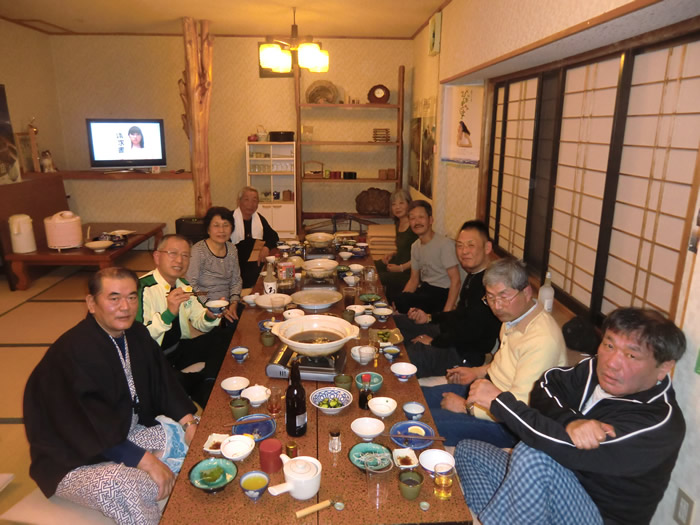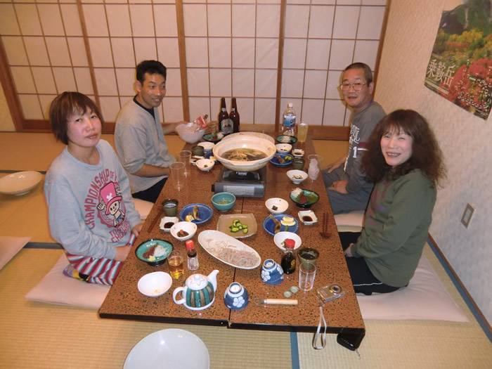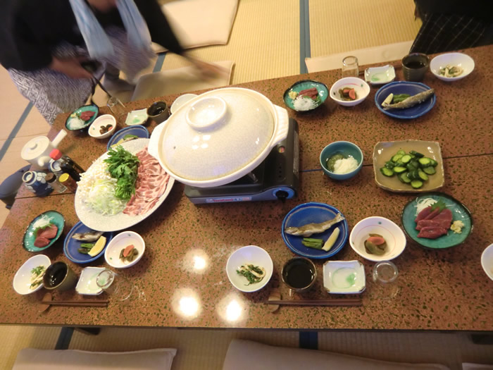 楽しみの夕食。豚シャブ,あまごの塩焼き、馬刺し。24時間の温泉入浴。ビールでカンパーイ。