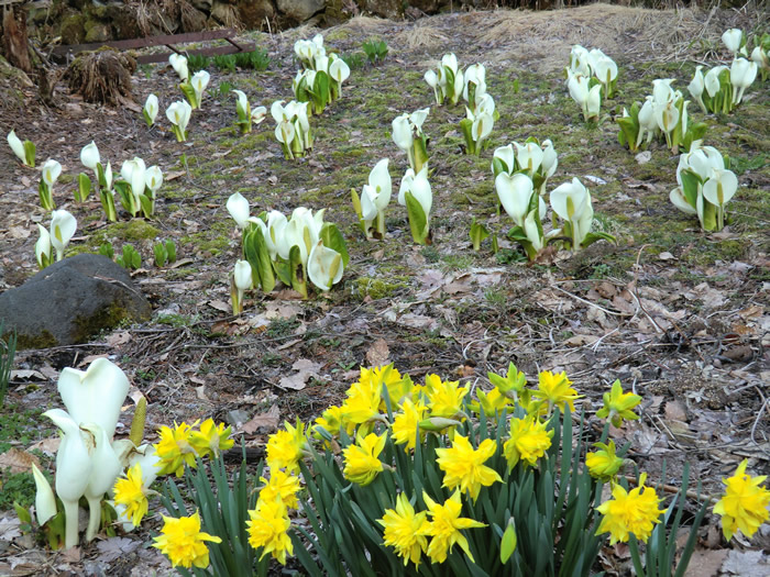 丘の上フュツテの庭には、黄色の水仙、白の水芭蕉が満開。