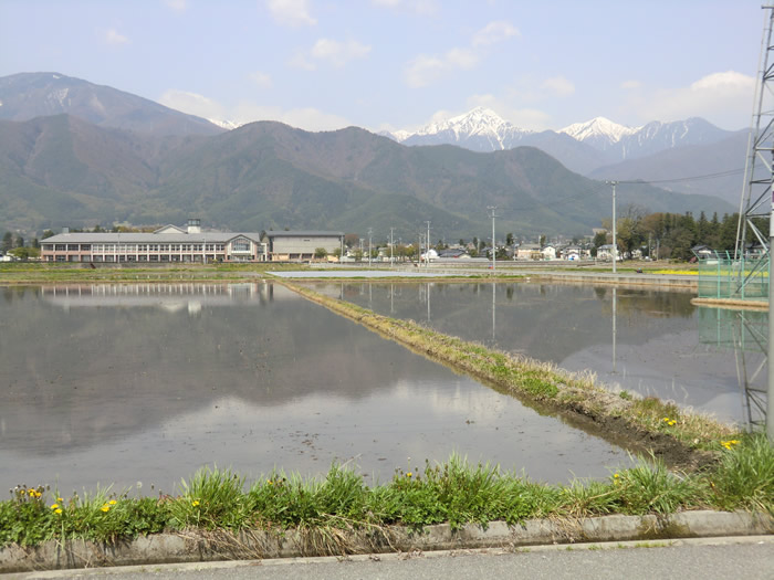飛騨山脈の槍ケ岳が水田に映っている。R147を白馬へと走る。