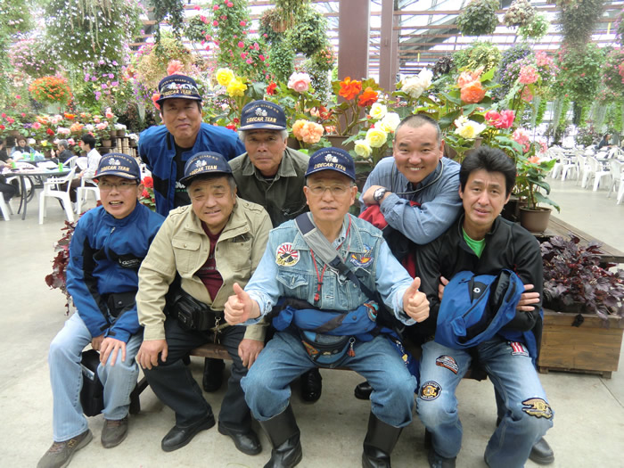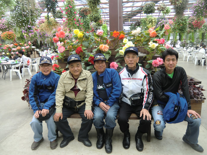 お花に包まれ、仲間と記念写真だ。 |