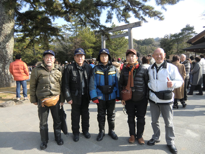 伊勢神宮(内宮)参道前で記念写真。 鳥居前から参拝者で大渋滞でした。