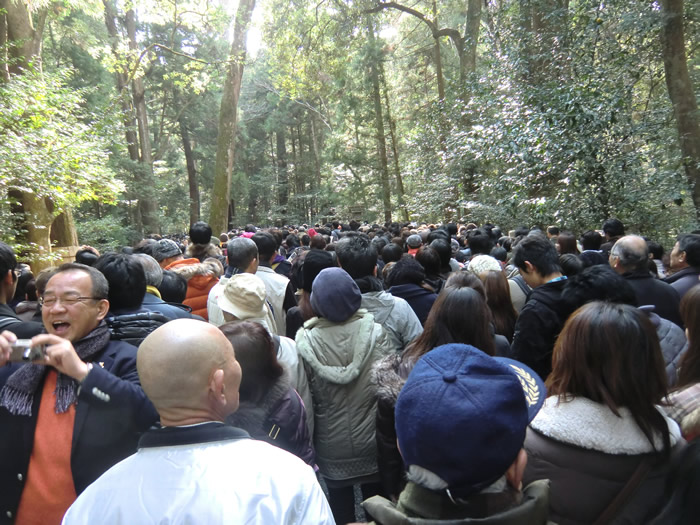 本宮手前 100メートルで人の波が止まる。半歩のすり足6歩進んで1回休み。