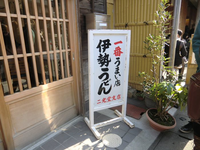 pm1:30 10人位の行列に並ぶ。「一番うまい店 伊勢うどん」の看板が出ている。