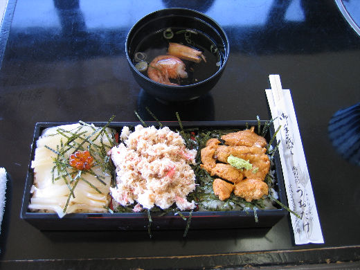 ○ 三色どんぶり イカ・カニ・イクラ・ウニの中から好きなものを3つ注文する。ご飯は寿司ご飯です。 これで1,980円は安い!!