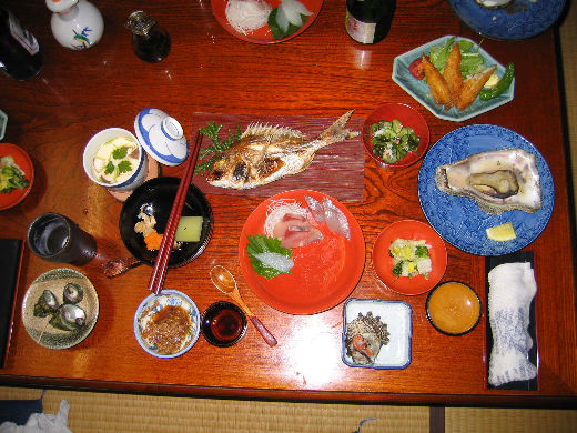 ○ 温泉民宿・深三(ふかさん)の夕食 刺身はカワハギの肝を付けていただきます。 輪島塗の漆器(うつわ)で盛られた旬の恵み! 温泉につかった後のビールは、う・ま・いっ!!