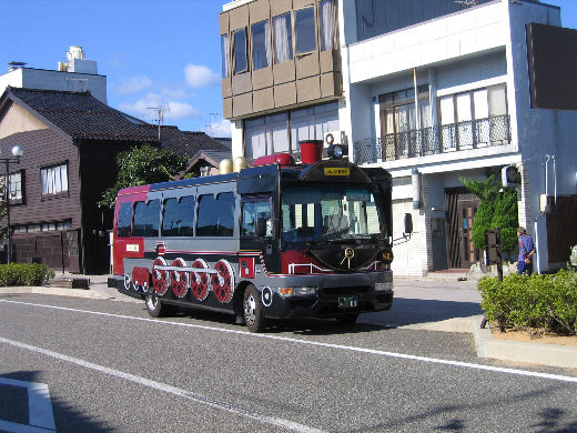 ○ 朝市の近くで、道路を走る汽車発見! ・・路線バスだよ