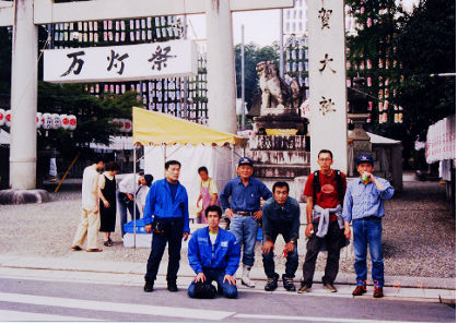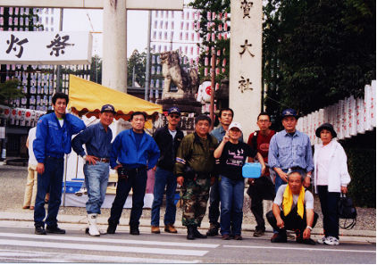 多賀大社前にて、糸切り餅をおみやげに!Aさん左手に抱えてピース(^_^)