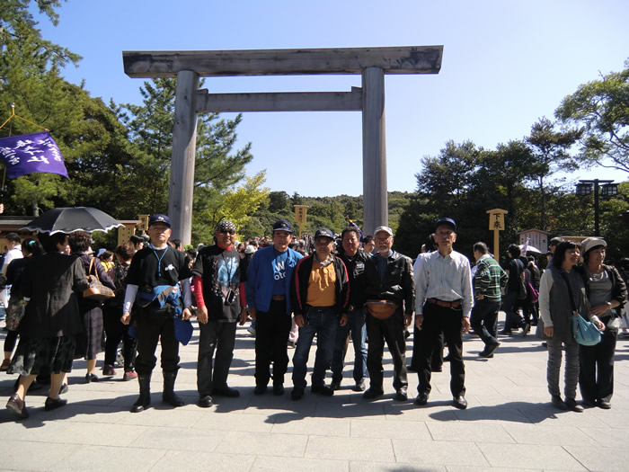![]() 内宮の鳥居前で記念写真。 おはらい町で伊勢うどんを 頂きましょう。 |