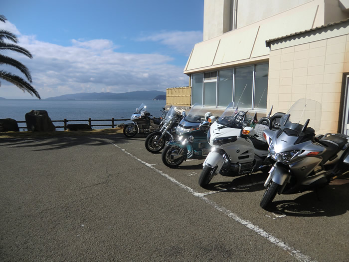 皆さんいい笑顔!!吾妻屋シーサイドホテルの駐車場にて。 後ろは友ケ島。 |