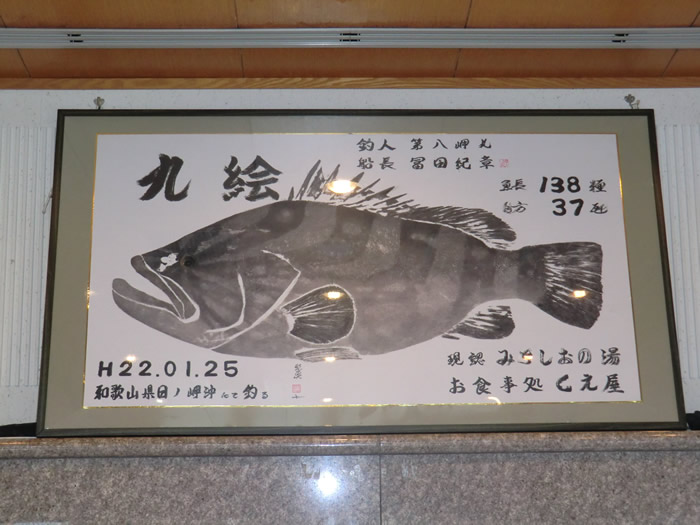 食堂は、みちしおの湯内のお食事処「くえ屋」。食堂には、兆大物 のくえの魚拓がかけられている。魚長138cm 重さ 37kgだ。 正式な名前は「九絵」やて。初めて知った。