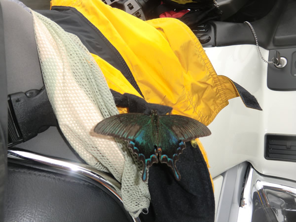 R42、「椿温泉はなの湯」でトイレ休憩、バイクに戻ると、紫アゲハが、GL1800の 合羽で羽を休めていた。黄色が好きなのかな。 |