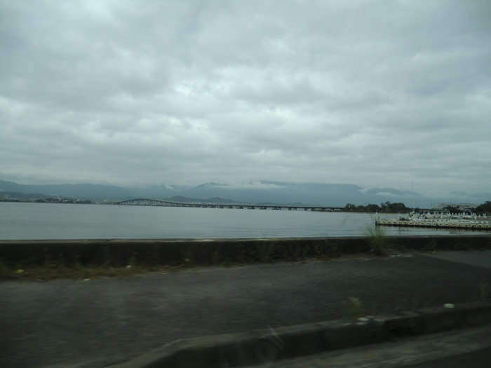 8:30am 法華寺ローソン出発 台風18号接近の影響で、雨の予報・・でバイクを自動車に切り 替える。 自動車4台8名・・・ 寂しいね。 左前方に琵琶湖大橋が見えてきた。
