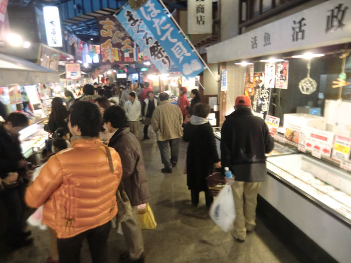 お魚等の買い物客でいっぱい。