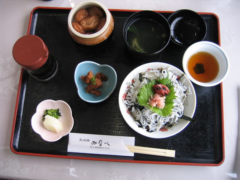 これがしらす丼だよ(840円)・・・梅は食べ放題。すっぱい!!塩辛い!!