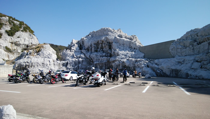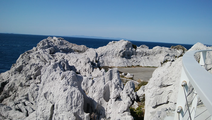 ![]() 14:00 みちしおの湯を出発し、白崎海岸公園を見学する。 石灰岩の奇岩が珍しい。 まるで雪の山。 |