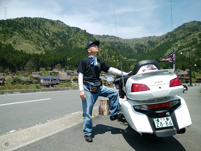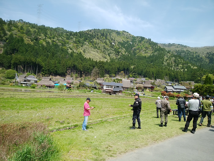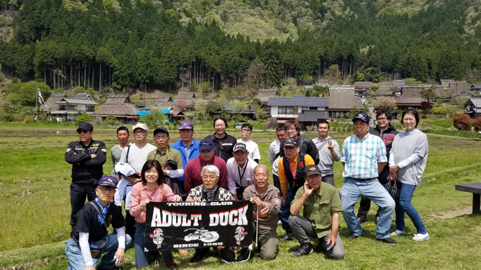 かやぶきの里をバックに記念写真。 やなさん、スマホのタイマー