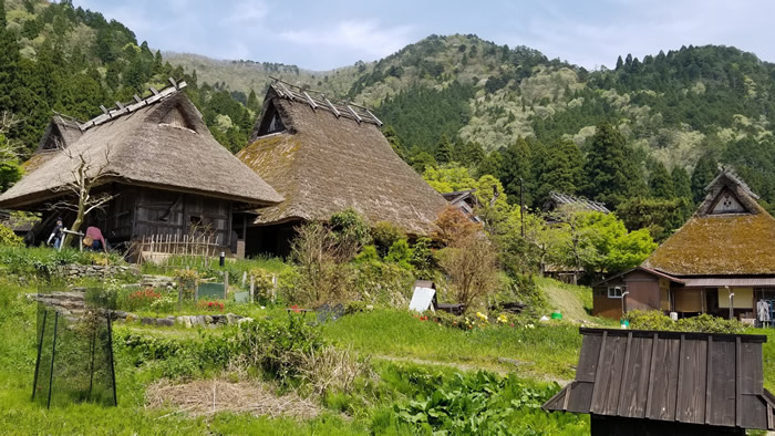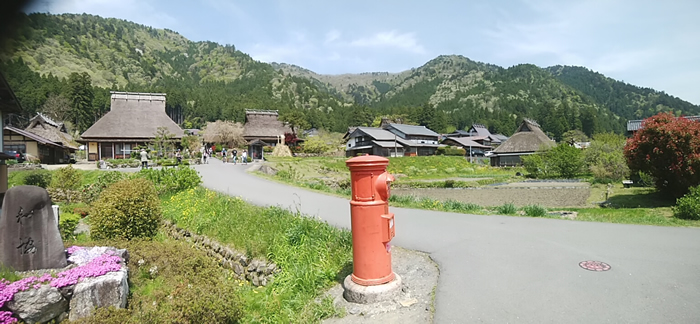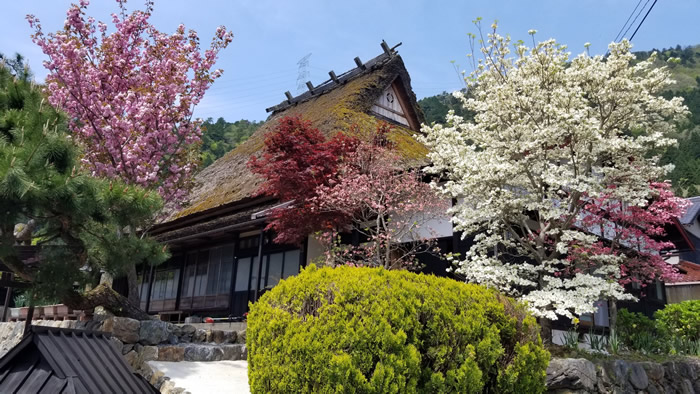 八重桜、ハナミズキが咲き誇っている・・かやぶきの里風景