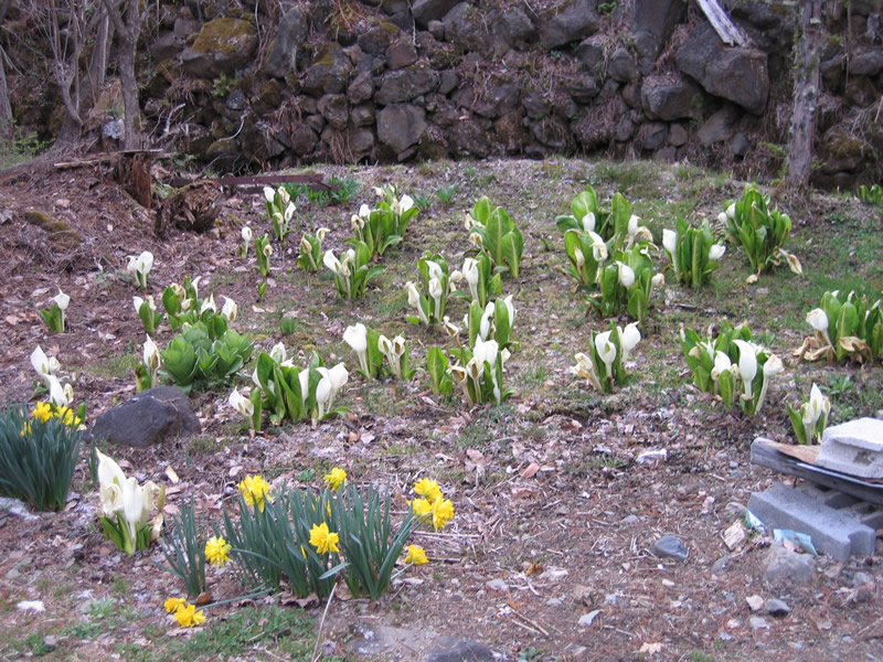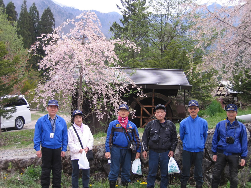 水車小屋と枝垂れ桜の前で・・・福地温泉にて |