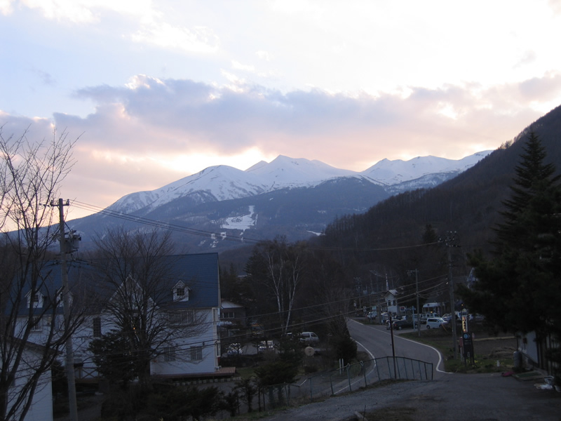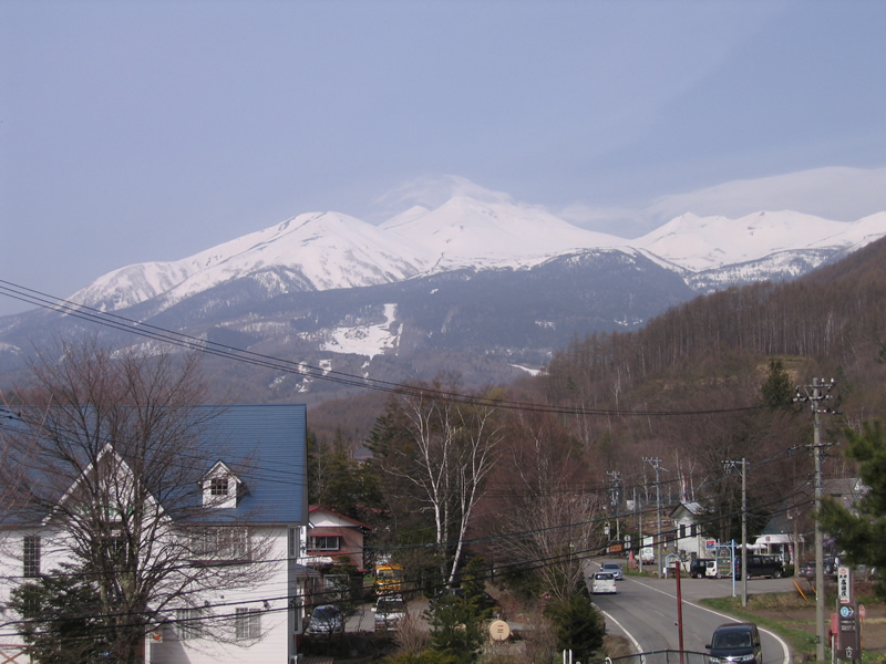「丘の上ヒュッテ」の前から乗鞍高原・乗鞍岳を展望。・・去年より雪が多いです。 「例年では、桜が満開ですよ」・・宿の女将。 |