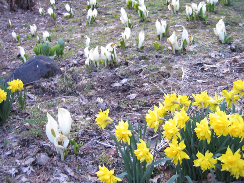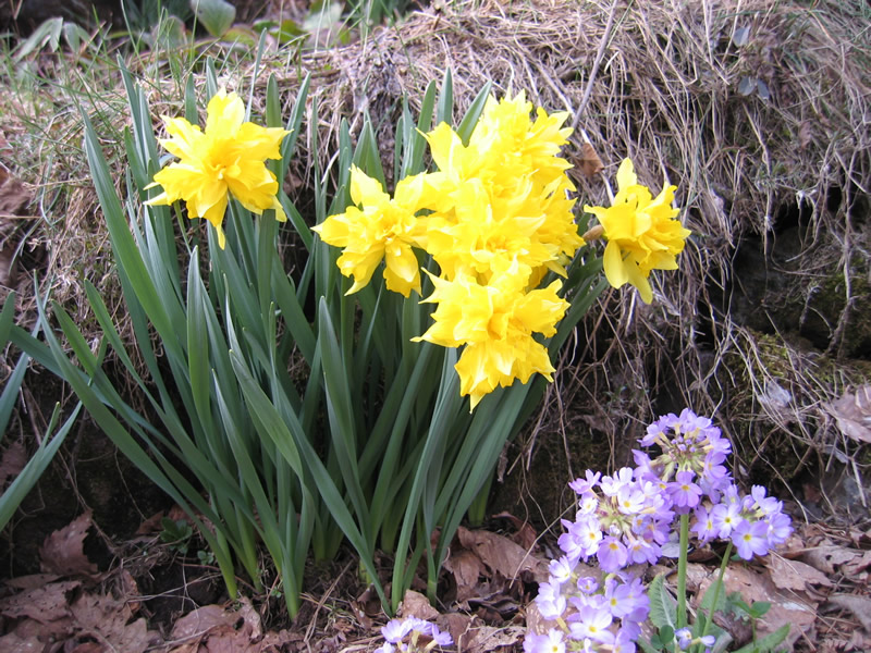 宿の前には、水芭蕉、水仙、紫のセブンイレブンが満開。