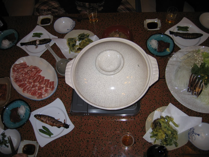 夕食は、豚シャブ、山菜の天ぷら、アメノ魚、鹿刺し・・お腹いっぱい召し上がれ。 お宿から、焼酎をサービス。お風呂は24時間源泉かけ流し、硫黄の匂いがします。 |