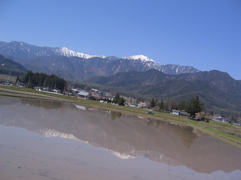 たんぼに映った北アルプス。地元の人は、この光景を見て、春を感じるとか。