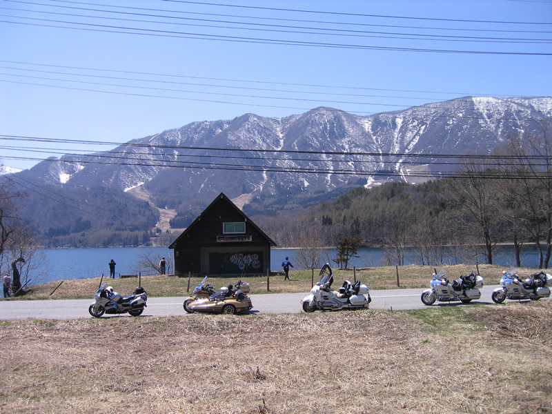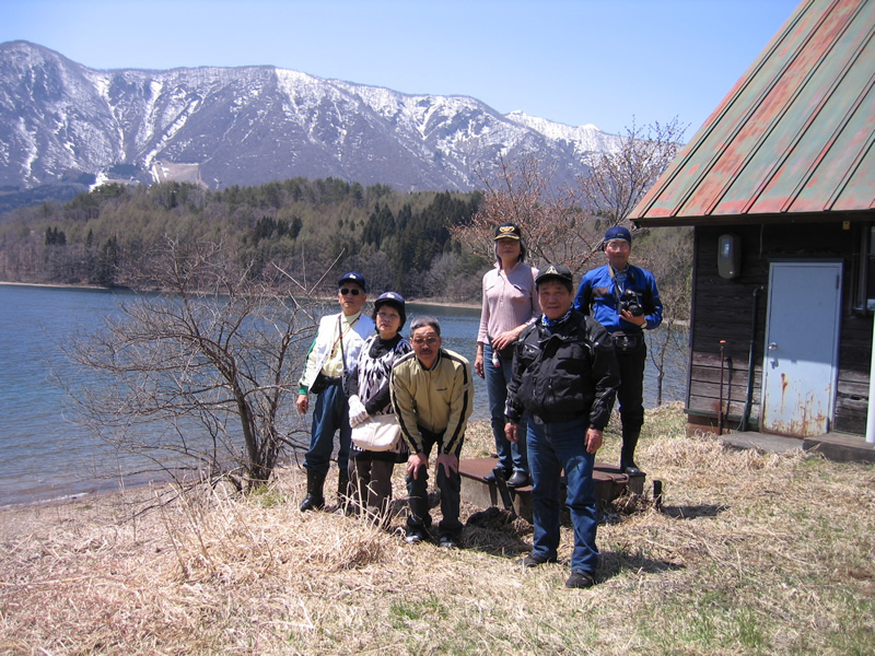 青木湖をバックに。