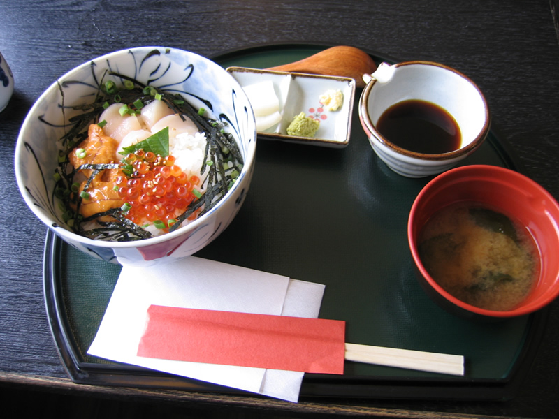 今日のおすすめの一品「三色丼」・・イクラ・ホタテ・ウニ・・ めちゃうま!甘いたれが美味しいです。おかわりぃ。