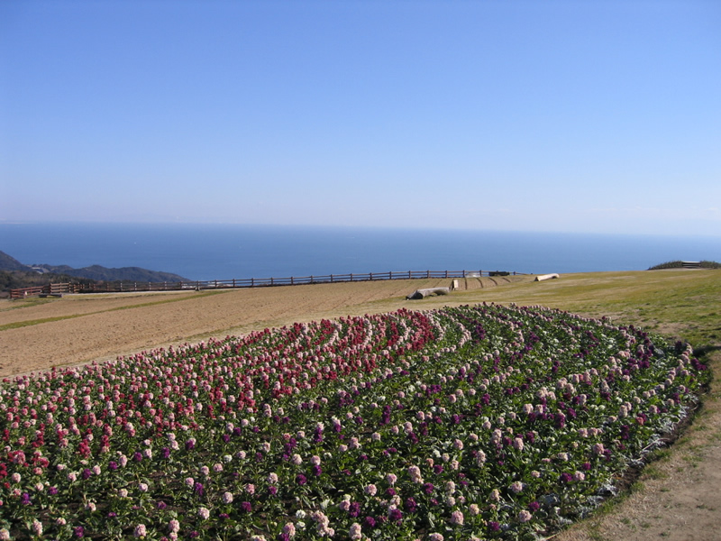 花「ストックパンジー」と青空と海のコントラスト・・・感動しました・・・あわじ花さじきにて