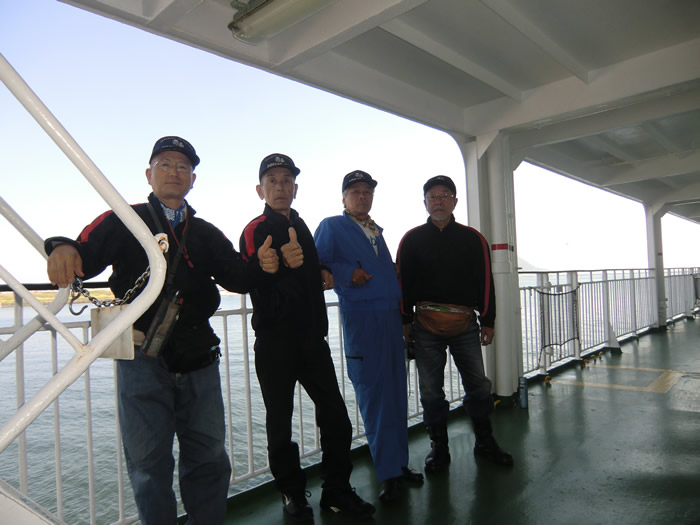 ![]() 岩ちゃんが、フェリーを予約してくれていたので、スムースに乗船手続きができた。 出航を待つメンバー。 |