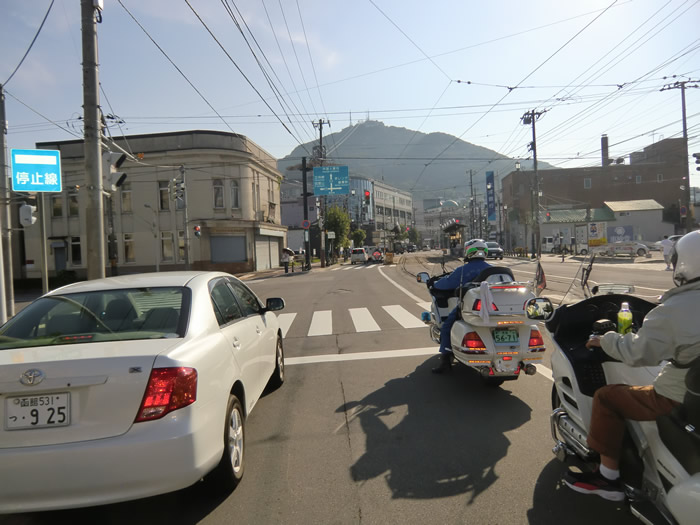 ![]() 正面に函館山が見えた。函館ウィニングホテルはもうすぐだ。 道路の中央は路面電車が走る。 |