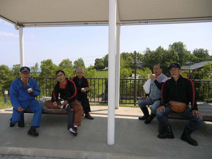 ![]() 利尻島をバックに記念写真を撮ろうとやなさんが、三脚を準備しかけるも、おーさんが、 通行人の村人のおばさんに、カメラのシャッターを頼む。おばさんは、カメラは初めて だった。 「景色がどっかへ行った。わしが映っとる」 一同大笑いする。でなんとかシ ャッターを押してもらったが、やなさんが、半分 しか映ってなかった。 結局やなさんが、 三脚でパシャ。あー疲れた。 |