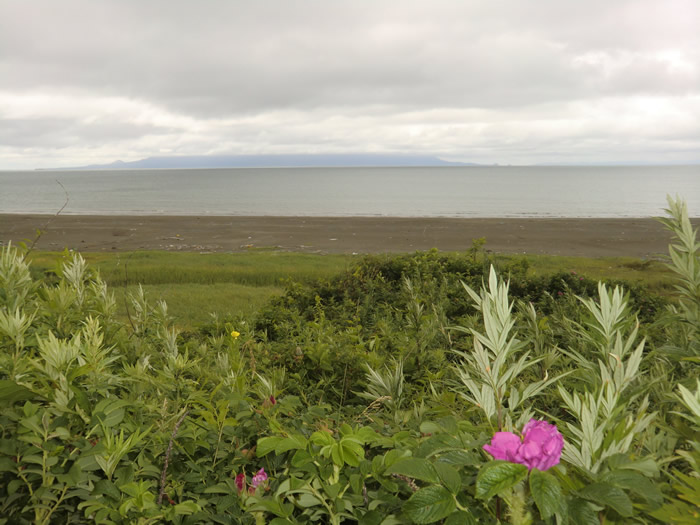 オロロンラインには,ところどころにハマナスが咲いていた。 海の向こうは、今日泊 |
