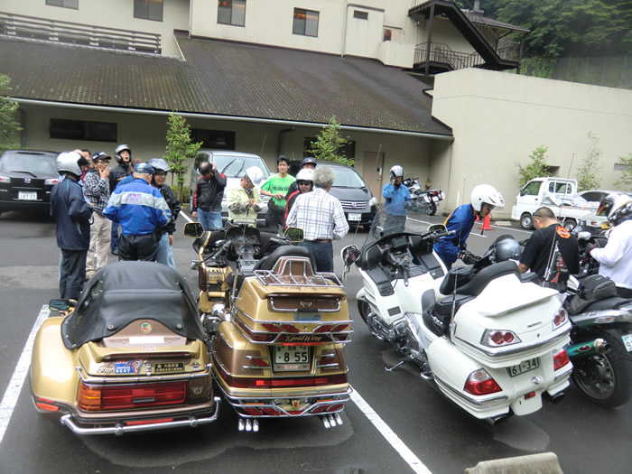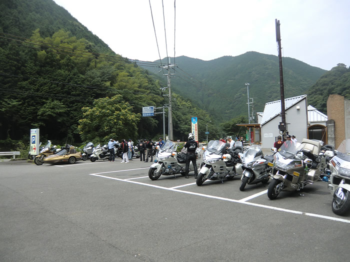 みんな集まってや。8月幹事のいけさんから、来月のツーリングの発表とミーティング・・・ 早速、岩さんが、参加申込受付を開始する・・・龍神温泉にて。 にっしゃん、やなさん、合羽を着用する。・・・やなさんが、合羽着たら雨は降らない・・BMWの 奥さん・・・当たりました。雨は、降りませんでしたね。やなさん、高野山で合羽を脱ぐ。