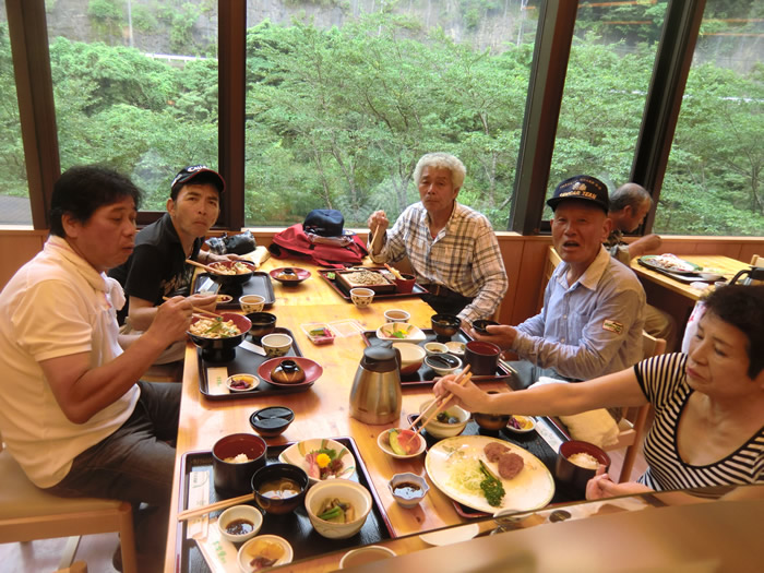 やなさん、やぶさんの奥さんから豚カツの差し入れに笑顔。いけさん、ネギ入ってなかったね。